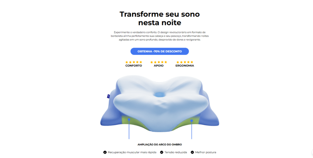 O travesseiro que muda tudo Design ergonômico revolucionário que funciona com seu corpo, possibilitando um sono profundo e manhãs sem dor. 70% de desconto - Último dia para Aproveitar esta Grande Promoção Acaba com as dores pela manhã Experimente Rem Riscos